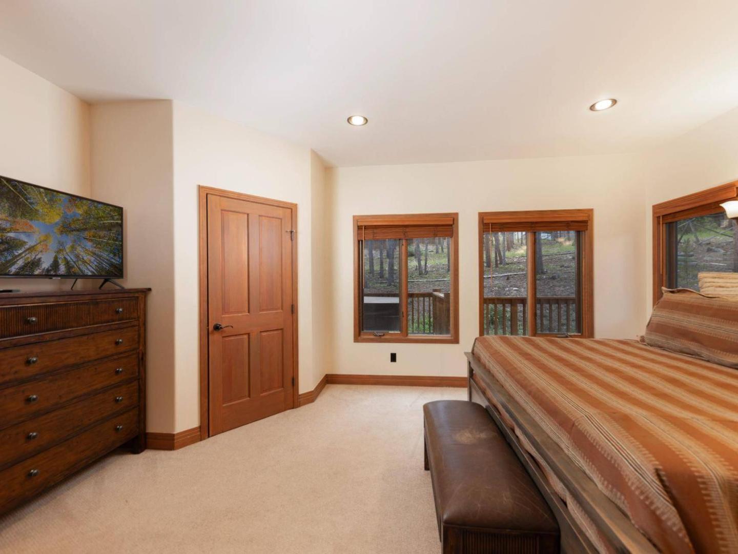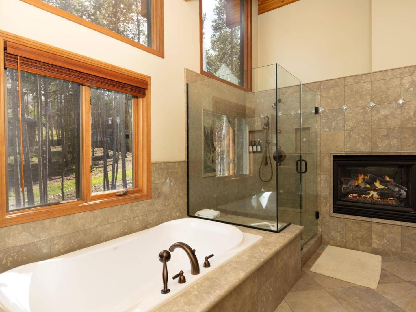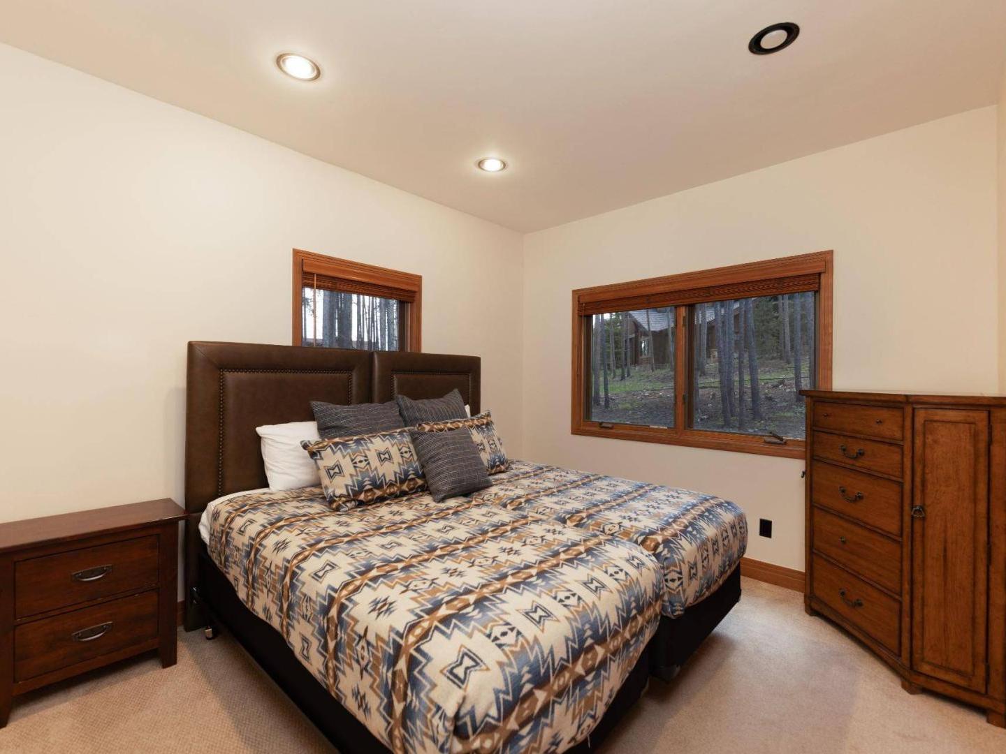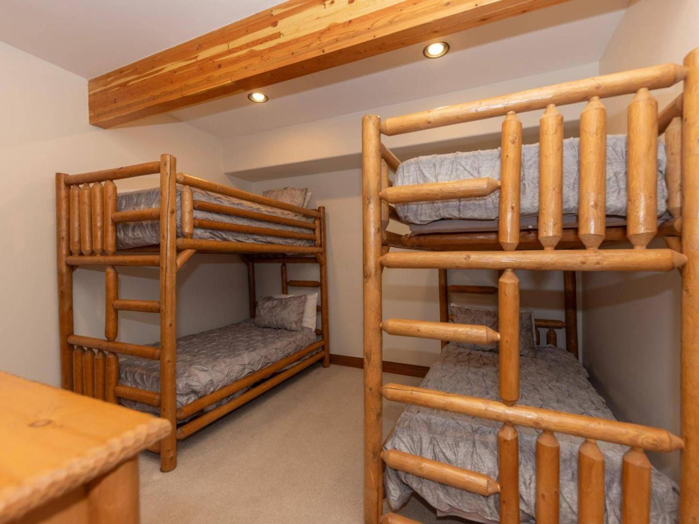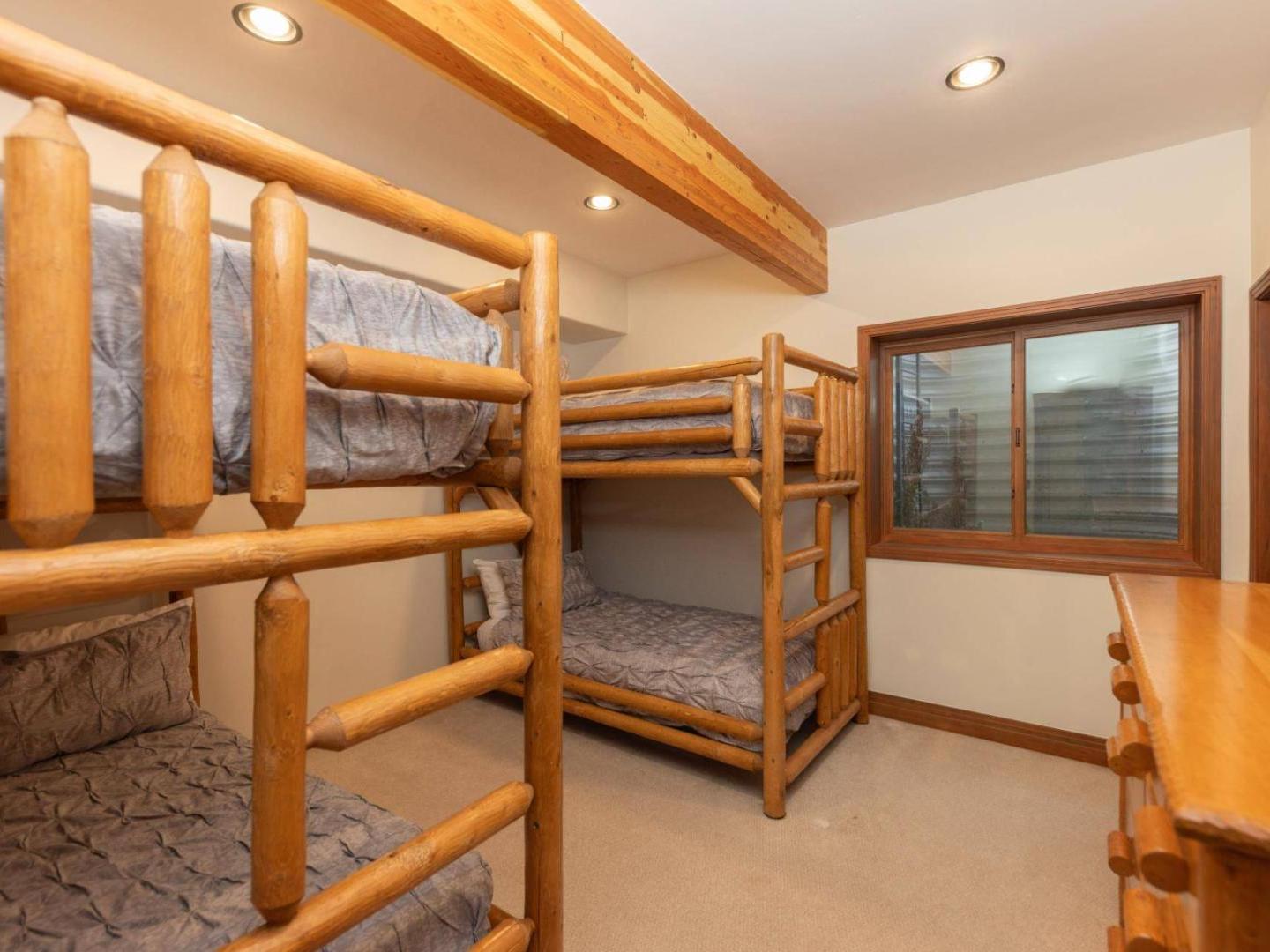 Perched on the upper level, the primary bedroom is appointed with a King bed, desk and double-sided fireplace open to the sleeping area as well as the private bathroom equipped with a dual-sink vanity, soaking tub and walk-in shower. Furnished with a King bed, one of the main level bedrooms includes a private bathroom with a dual-sink vanity, soaking tub and walk-in shower. Utilizing a bathroom shared with the living space, the other main level guest bedroom offers two Twin beds that can be joined to form a King bed. Perfect for the kids in the group, the lower level bedroom has two sets of Twin over Twin bunk beds and shares a bathroom with the family room.