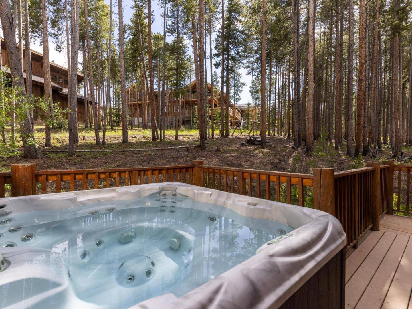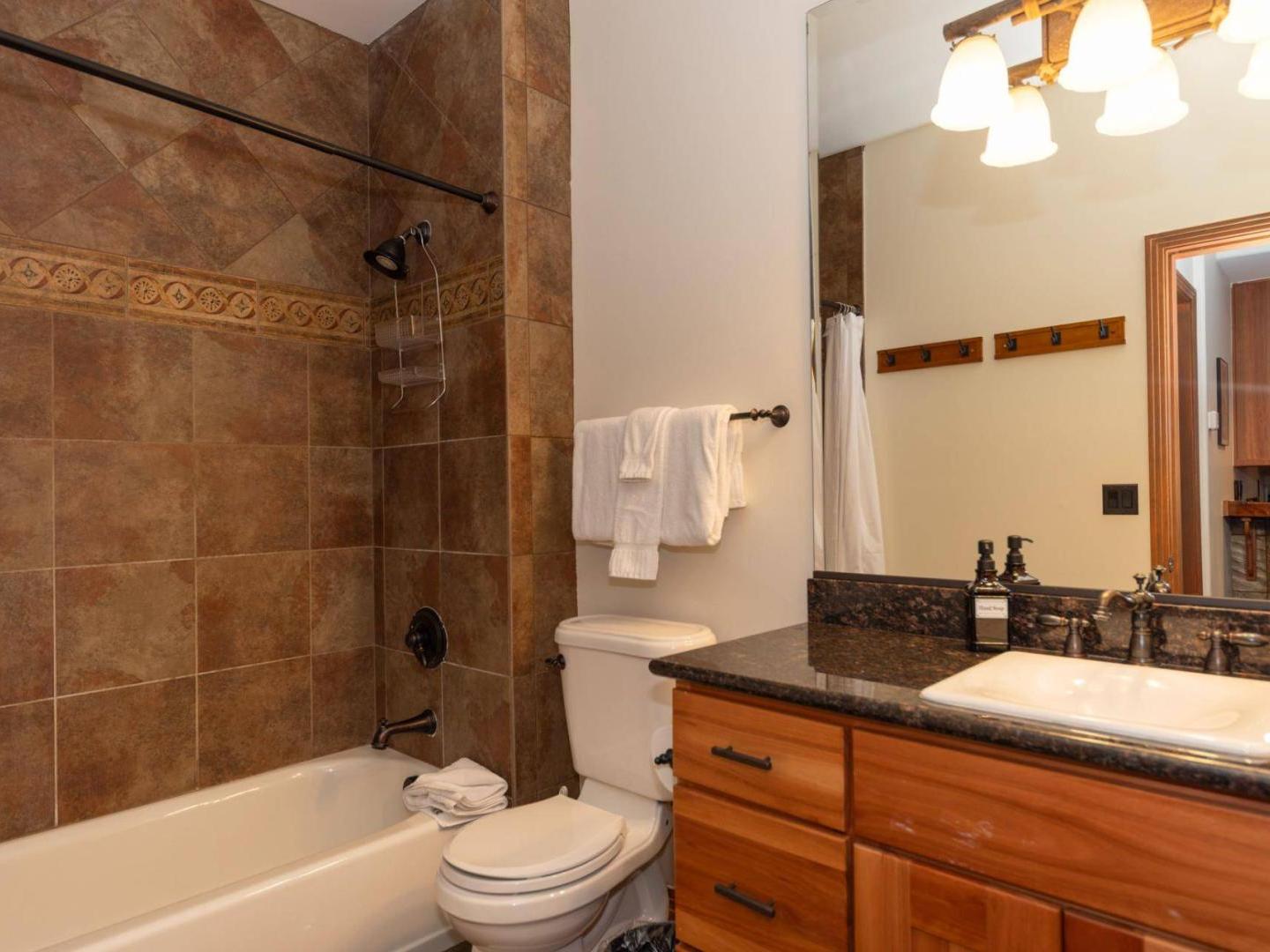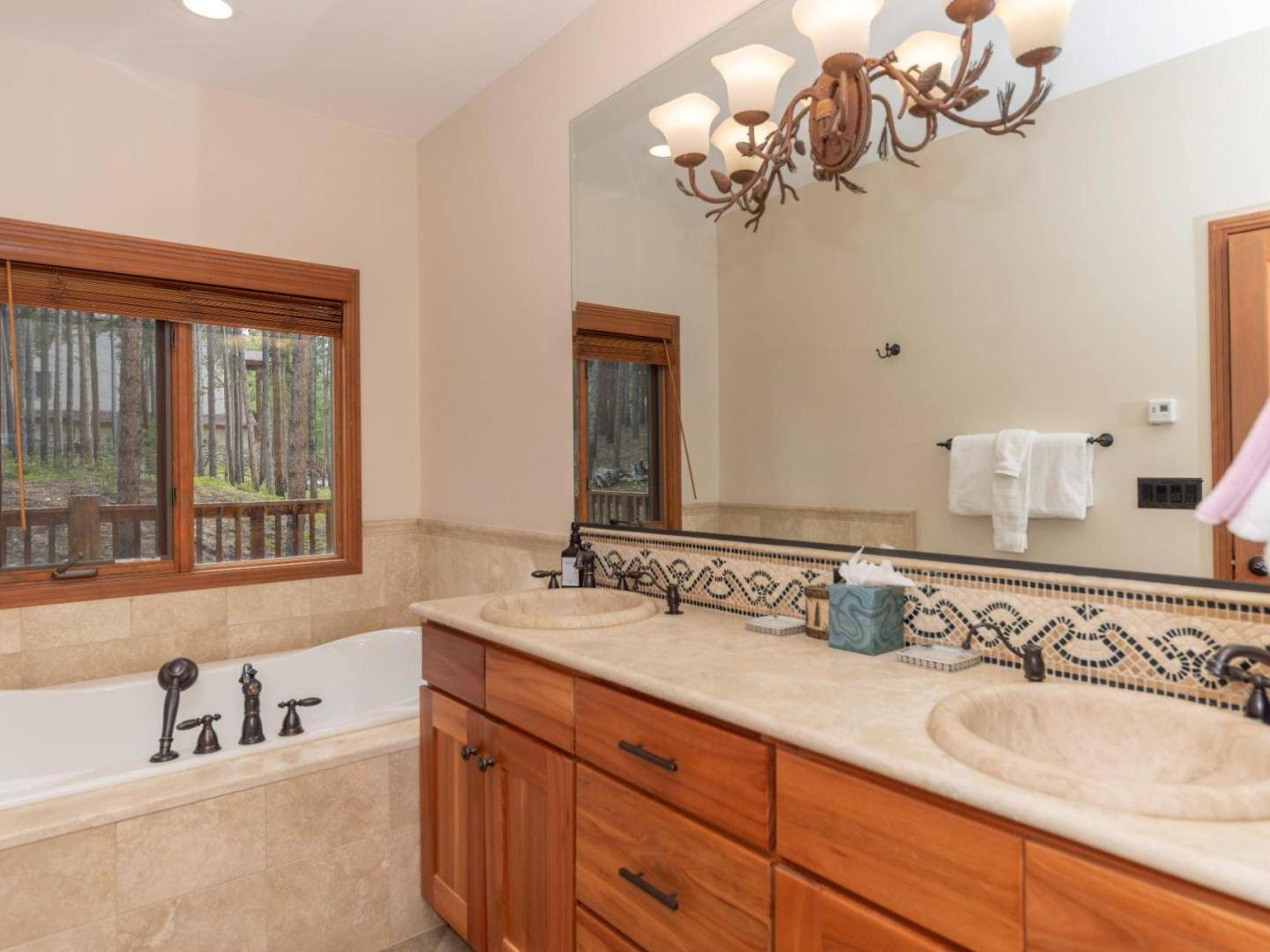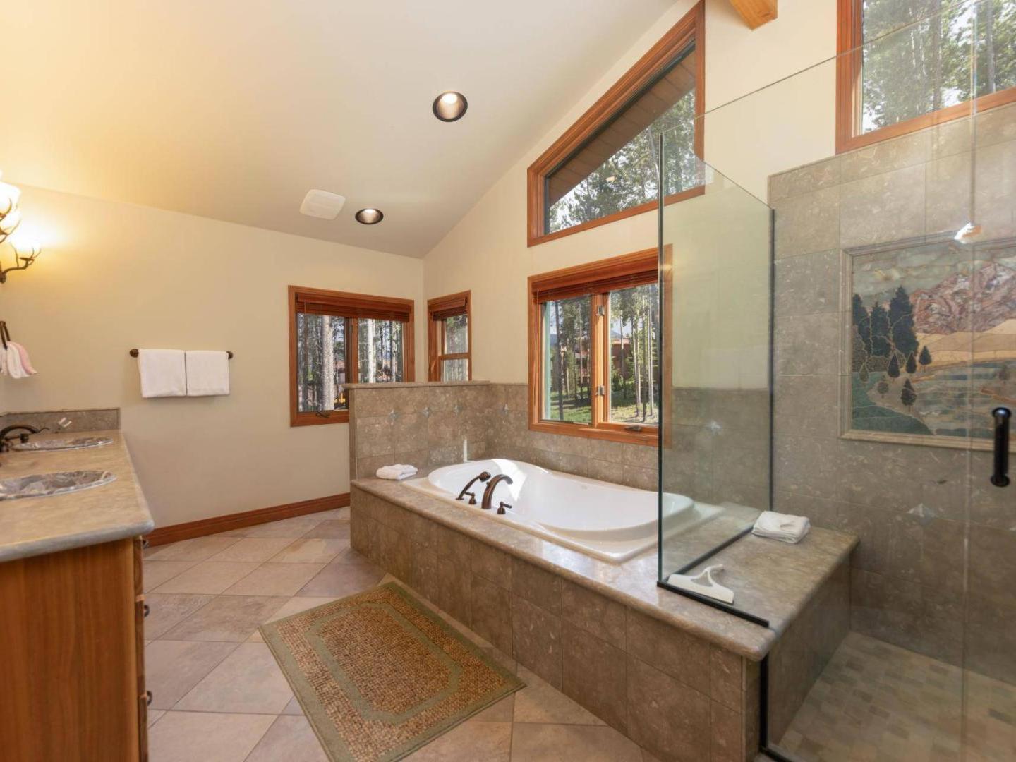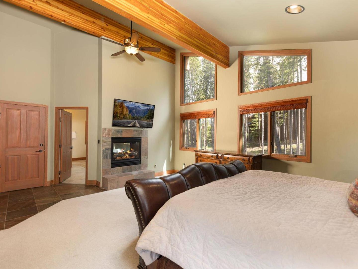 Perched on the upper level, the primary bedroom is appointed with a King bed, desk and double-sided fireplace open to the sleeping area as well as the private bathroom equipped with a dual-sink vanity, soaking tub and walk-in shower. Furnished with a King bed, one of the main level bedrooms includes a private bathroom with a dual-sink vanity, soaking tub and walk-in shower. Utilizing a bathroom shared with the living space, the other main level guest bedroom offers two Twin beds that can be joined to form a King bed. Perfect for the kids in the group, the lower level bedroom has two sets of Twin over Twin bunk beds and shares a bathroom with the family room.