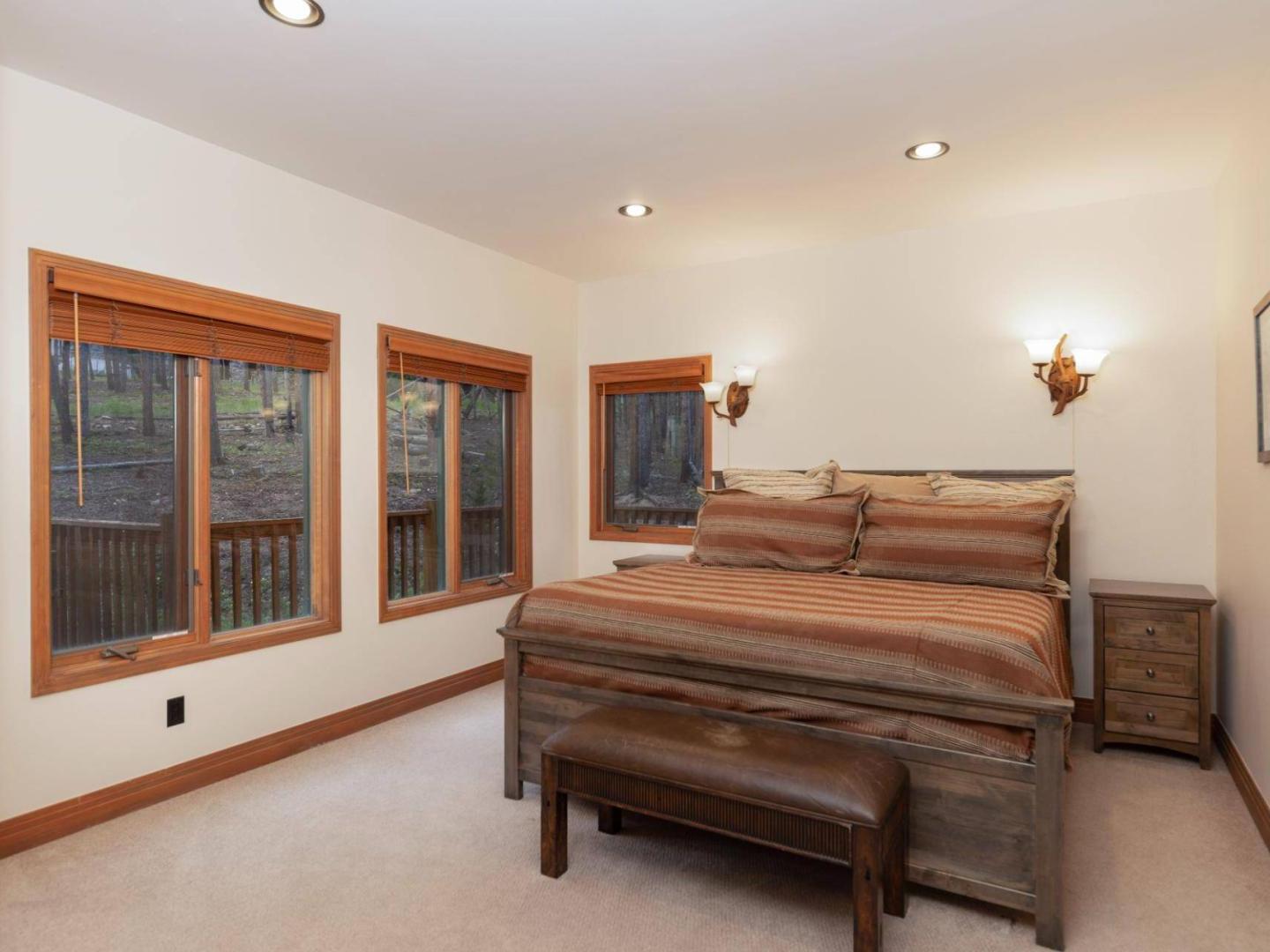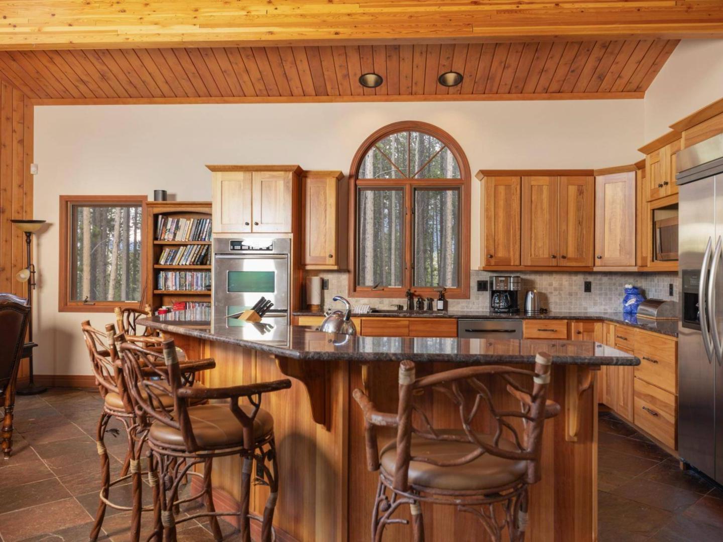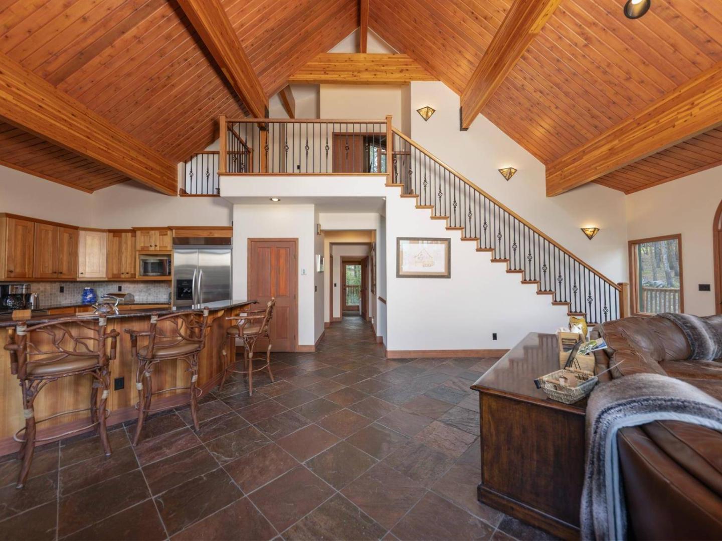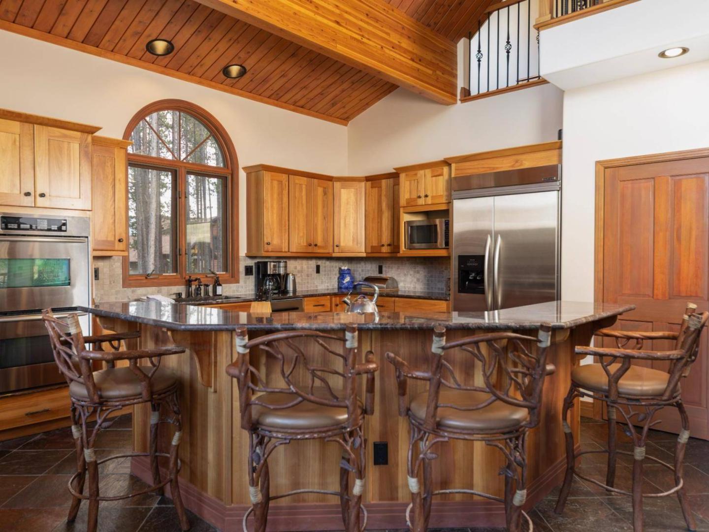 Gather and entertain in the cavernous Great Room of this 4 bedroom, 4 bathroom slope-side vacation home featuring soaring vaulted ceilings with exposed beams and a massive window-wall that brings the forested views right into the living space. Centered on a fireplace and wall-mounted television, the living room is appointed with a large leather sofa and includes access to the deck, equipped with a barbecue grill, through glass doors. Set off of the sitting area, the large dining table accommodates 8 guests while the adjacent breakfast bar can host 4 diners. Outfitted with stainless steel appliances and granite countertops, the fully equipped kitchen invites the chefs in the group to prepare tasty meals while not missing out on any of the fun.