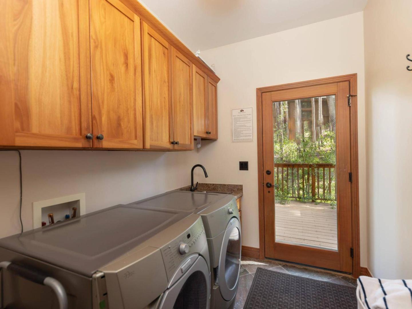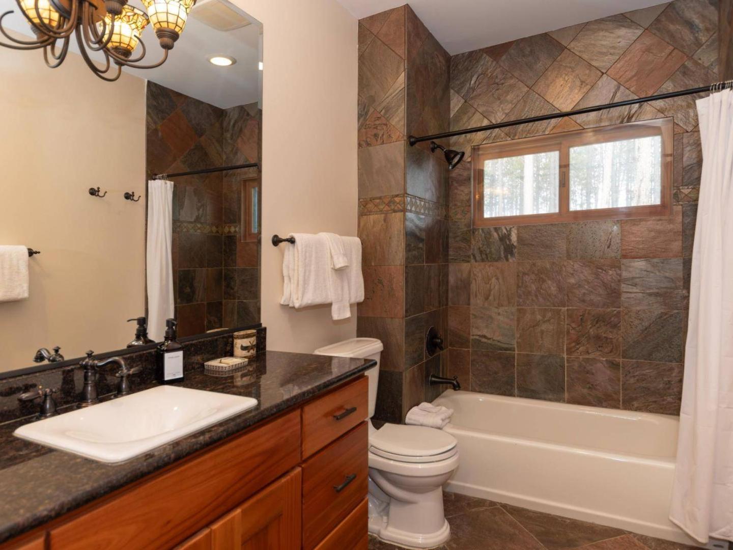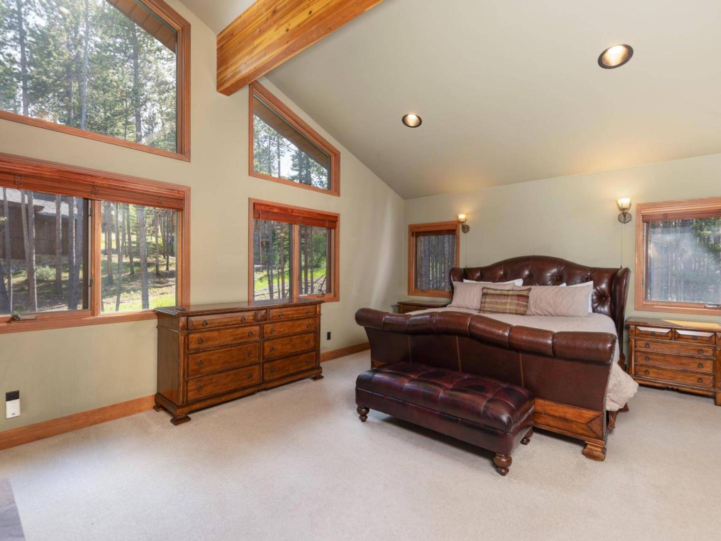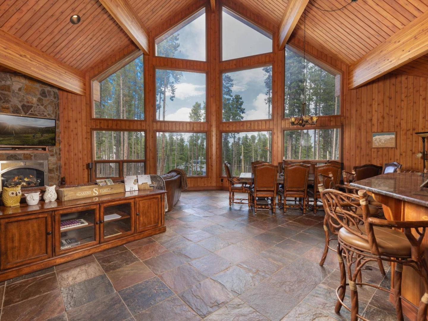 Gather and entertain in the cavernous Great Room of this 4 bedroom, 4 bathroom slope-side vacation home featuring soaring vaulted ceilings with exposed beams and a massive window-wall that brings the forested views right into the living space. Centered on a fireplace and wall-mounted television, the living room is appointed with a large leather sofa and includes access to the deck, equipped with a barbecue grill, through glass doors. Set off of the sitting area, the large dining table accommodates 8 guests while the adjacent breakfast bar can host 4 diners. Outfitted with stainless steel appliances and granite countertops, the fully equipped kitchen invites the chefs in the group to prepare tasty meals while not missing out on any of the fun.