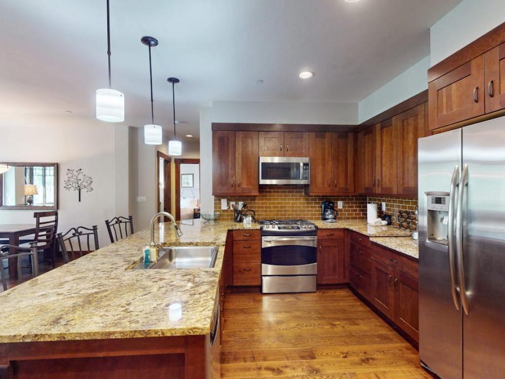 Featuring an open layout providing an inviting space to relax and entertain, Waterhouse's collection of 2-4 bedroom vacation rentals include all of the conveniences of home. In the main living space, the cozy living room with quality furnishings centered on a fireplace, is open to a dining area and fully equipped kitchen. Upscale appliances and granite countertops with a breakfast bar are featured in the fully equipped kitchen.