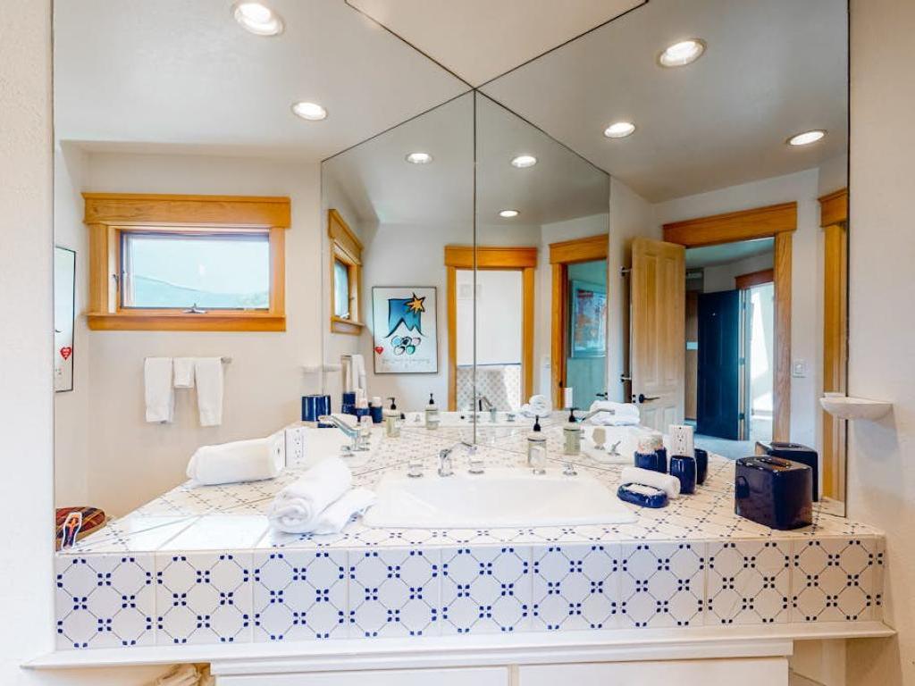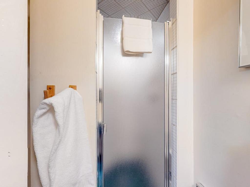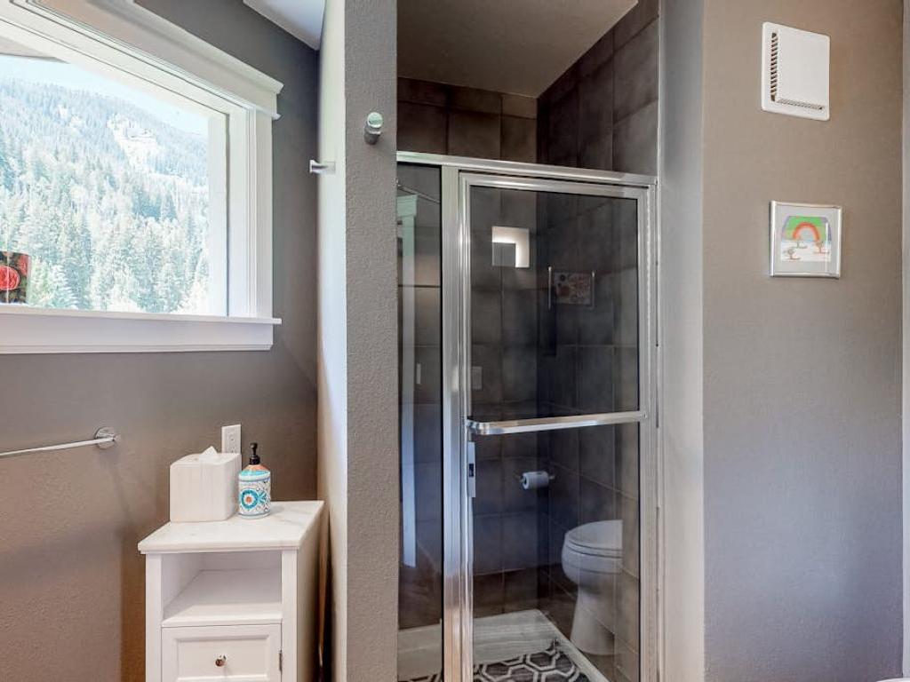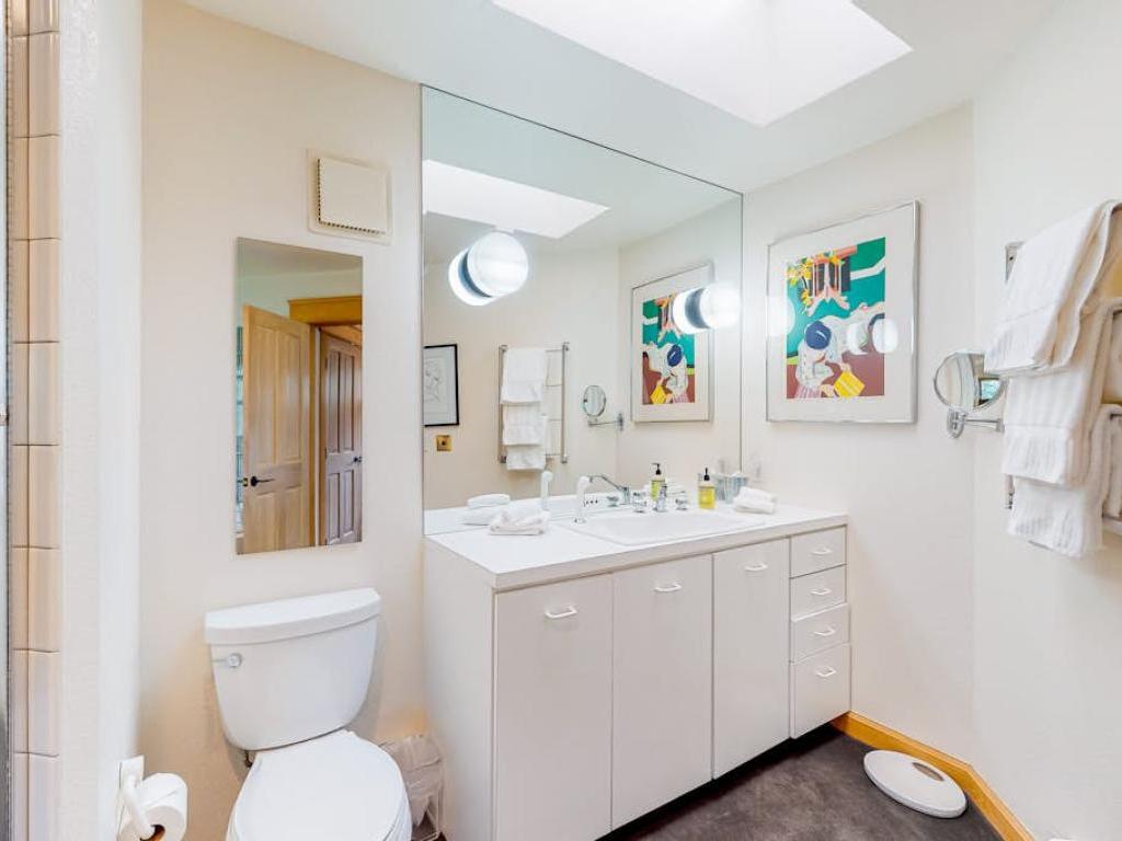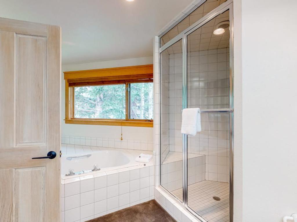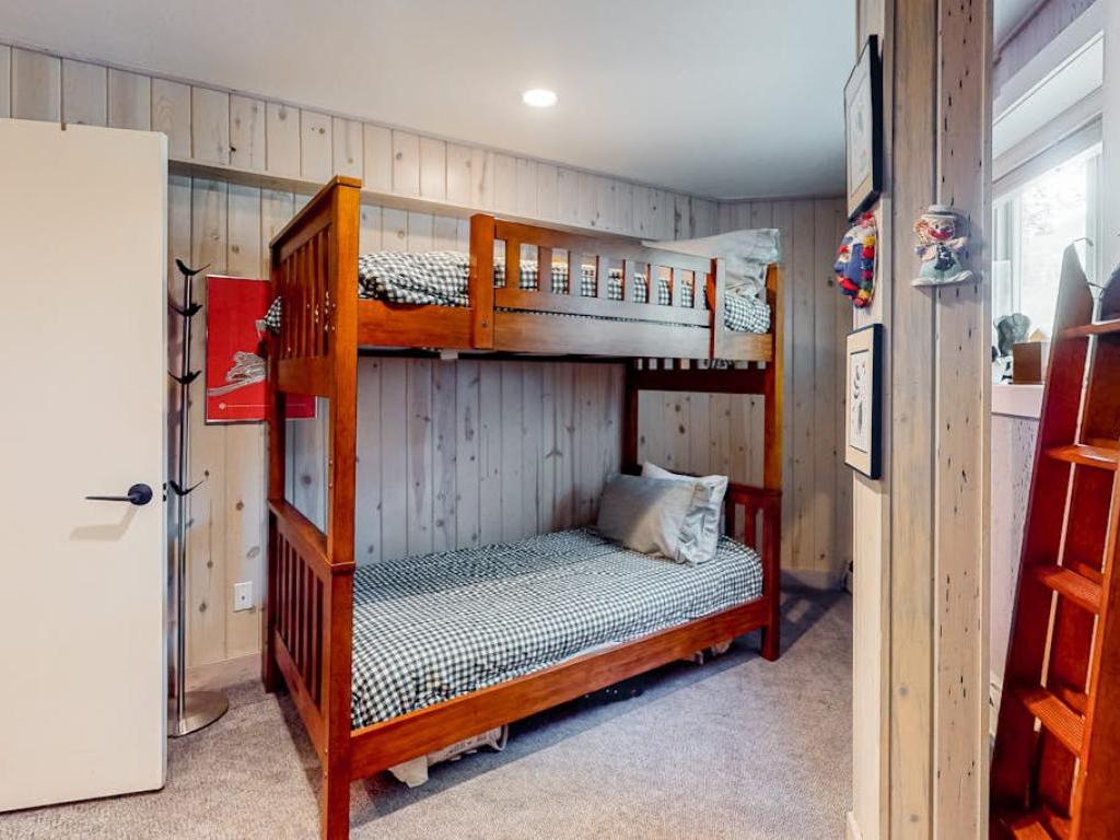 Both upper level bedrooms include private bathrooms, one is furnished with a King bed and has a soaking tub as well as a steam shower while the other has a Queen bed and walk-in shower. Utilizing a full bathroom shared with the living space, the main level guest bedroom is equipped with a Queen bed. Each of the lower bedrooms enjoys a private bathroom, one is outfitted with a Queen bed while the other offers two sets of Twin over Twin bunk beds.