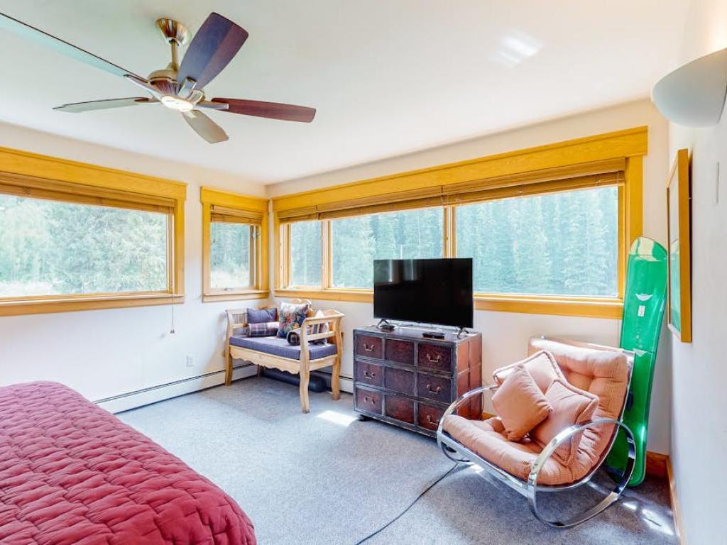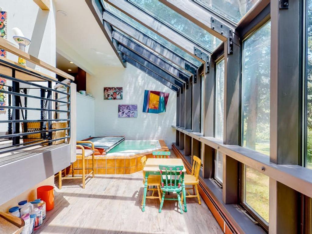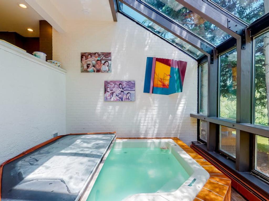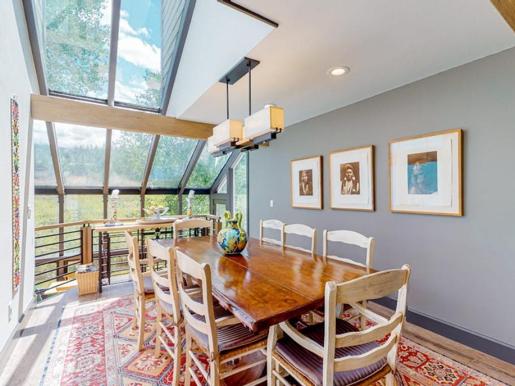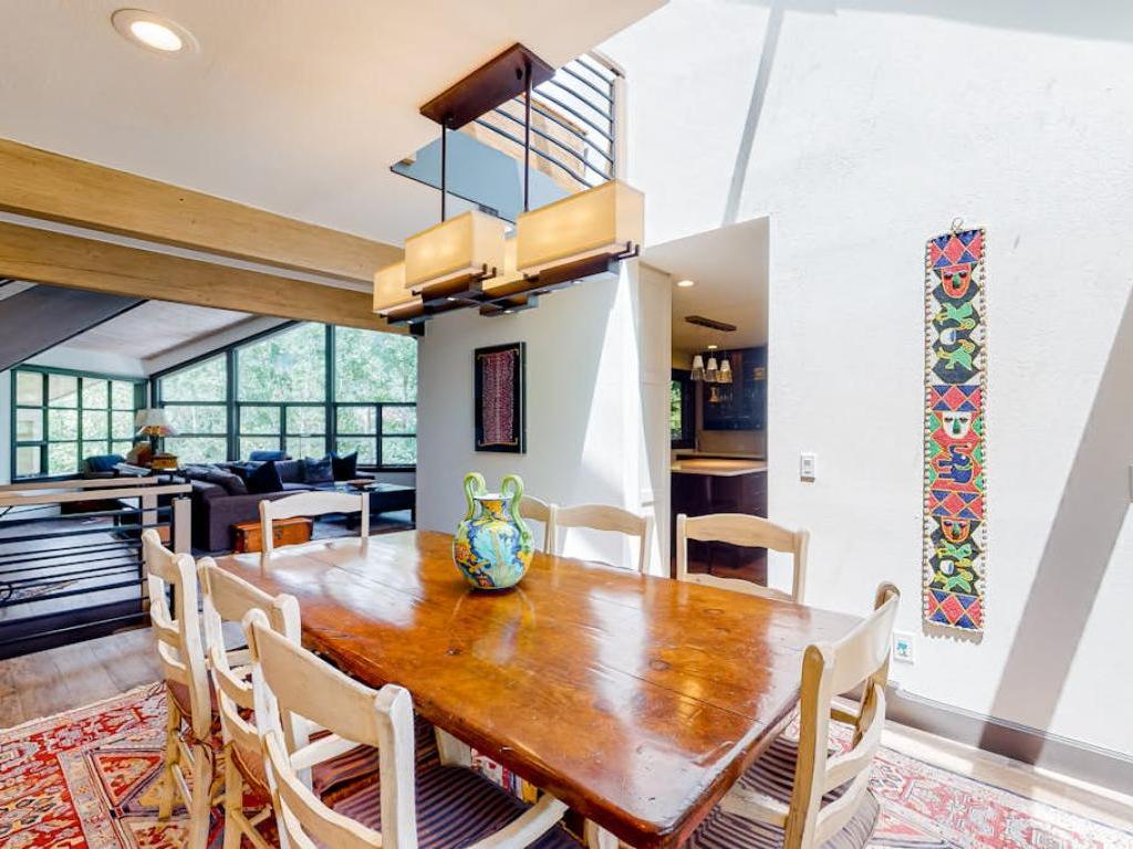 Set under vaulted ceilings with a wall of windows showcasing the surrounding forest views, the living room of this 5 bedroom, 5 bathroom duplex vacation home offers a comfortably furnished sitting area arranged in front of a wood-burning fireplace and wall-mounted television. Open to the living room and overlooking the solarium a half-level below, the dining area accommodates 8 guests and flows into the fully equipped kitchen featuring stainless steel appliances and a breakfast bar seating 2 guests. Step down to the window-framed solarium boasting an indoor hot tub and access to the backyard bordering the White River National Forest.