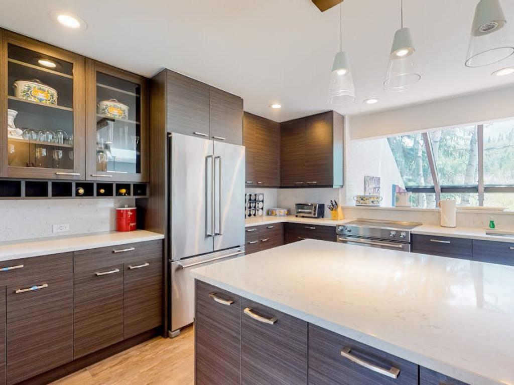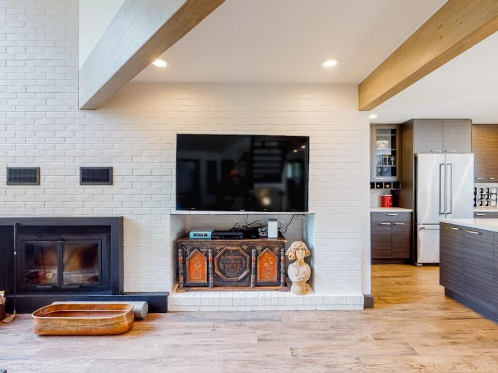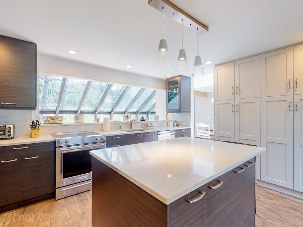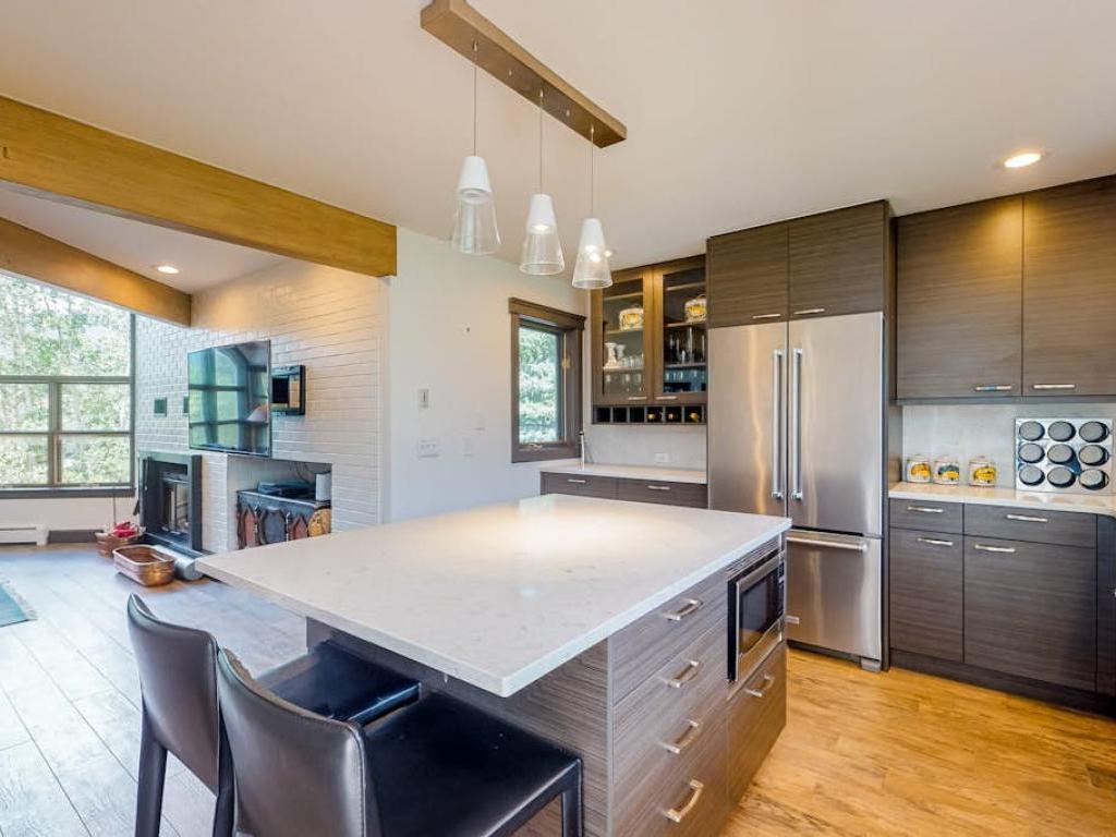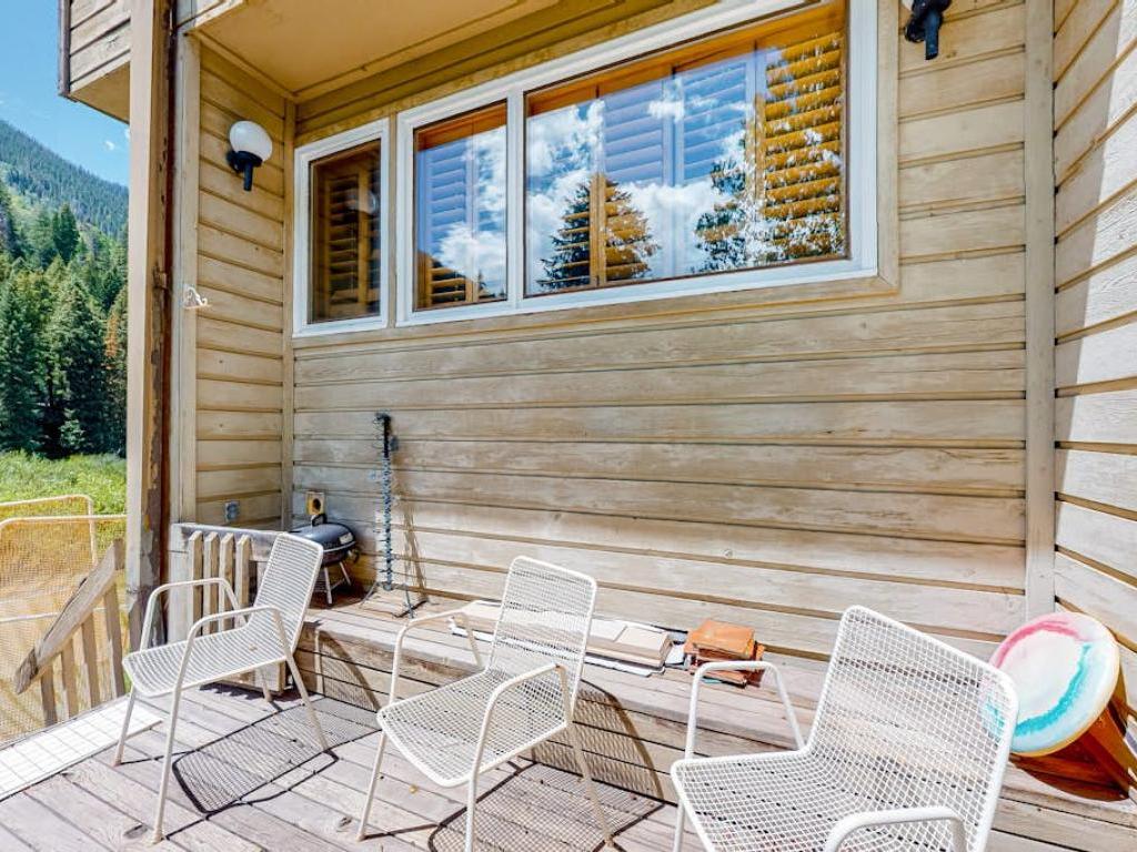 Set under vaulted ceilings with a wall of windows showcasing the surrounding forest views, the living room of this 5 bedroom, 5 bathroom duplex vacation home offers a comfortably furnished sitting area arranged in front of a wood-burning fireplace and wall-mounted television. Open to the living room and overlooking the solarium a half-level below, the dining area accommodates 8 guests and flows into the fully equipped kitchen featuring stainless steel appliances and a breakfast bar seating 2 guests. Step down to the window-framed solarium boasting an indoor hot tub and access to the backyard bordering the White River National Forest.